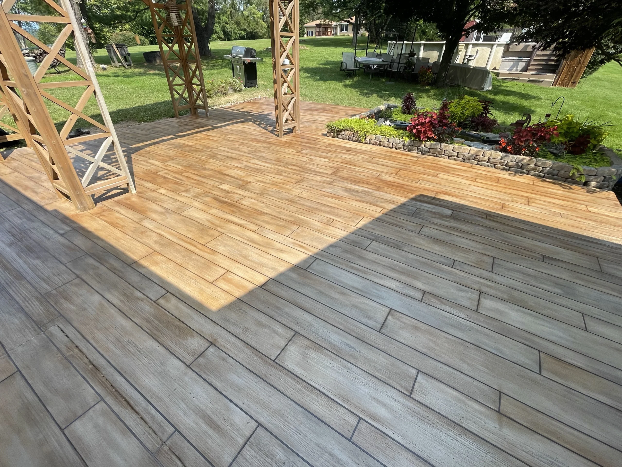 Rustic Concrete Wood is a multi-layer decorative overlay system applied directly to existing concrete. It uses a grout coat, texture coat, stain, and sealer to reproduce the grain, color, and character of real hardwood — on any concrete surface.